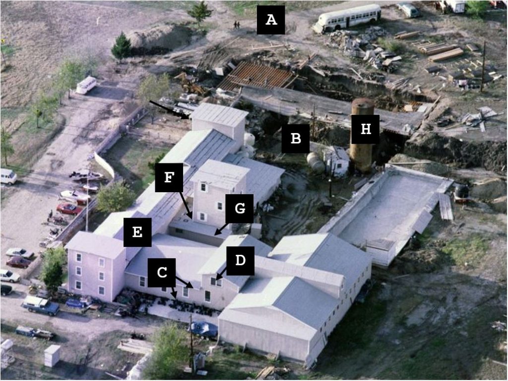 A las 9:45 am la ATF llegó en un convoy (A) de vehículos civiles que contenían personal uniformado con equipo táctico estilo SWAT. Se utilizaron tres helicópteros de la Guardia Nacional del Ejército como distracción aérea y reconocimiento de campo.