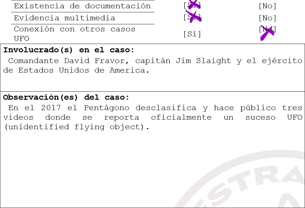 En el caso los radares de los portaviones perciben una señal de un objeto que había descendido unos 28000 pies en menos de un segundo. Cuando Fravor y Slaight fueron informados, vieron cómo algo volaba sobre el océano y agitaba las olas. El comandante David Fravor describe un objeto en forma de tic-tac. Momentos después nuevamente en el radar del USS Nimitz el mismo objeto aparece ahora a 97 kilómetros de distancia, ósea que, físicamente debió de haberse movido a 3900 km/h sin hacer ruido alguno (explosión sónica).