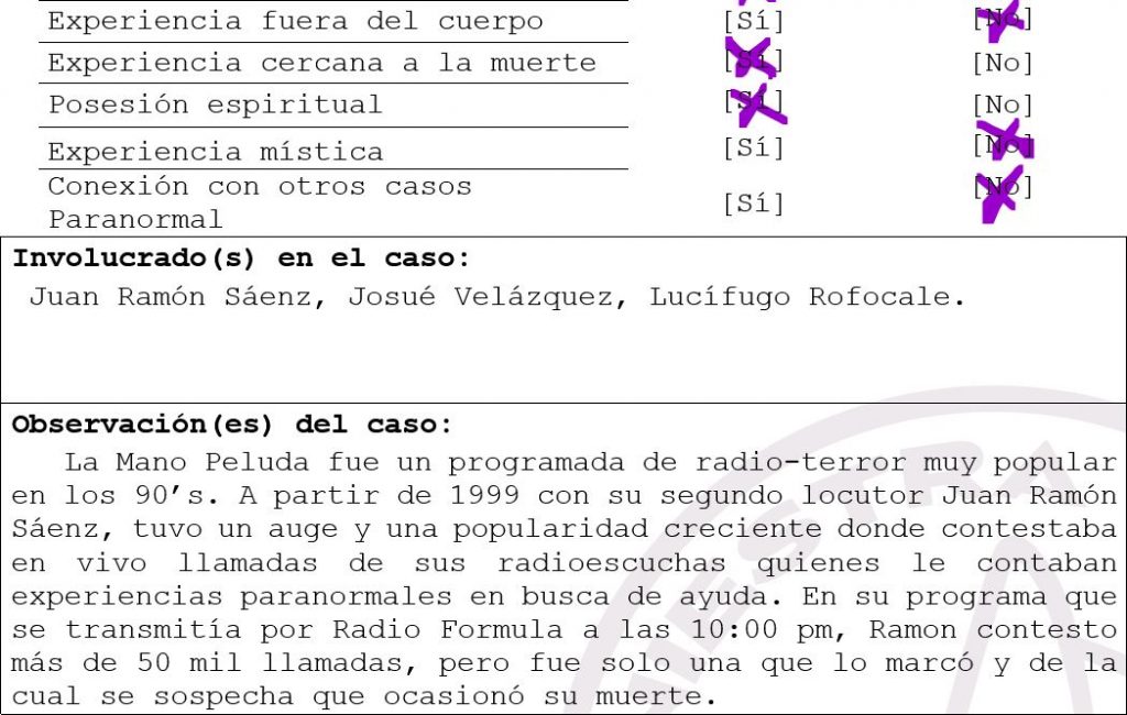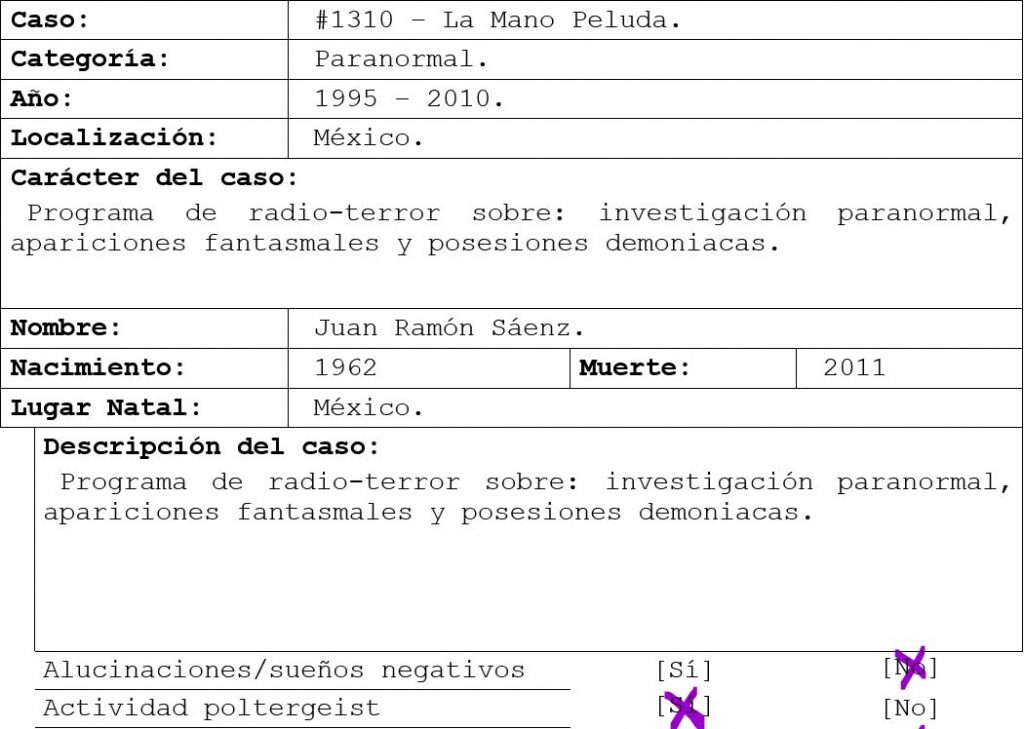 ADVERTENCIA: Las opiniones de los participantes y colaboradores no corresponden necesariamente con los del programa o la empresa, si este programa es escuchado por menores de edad se recomienda que lo hagan en compañía de un adulto, -Buenas noches soy Juan Ramon Sáenz, son las 10:00 p.m. y bienvenidos a su programa “La Mano Peluda” y aquí… se respira el miedo.
