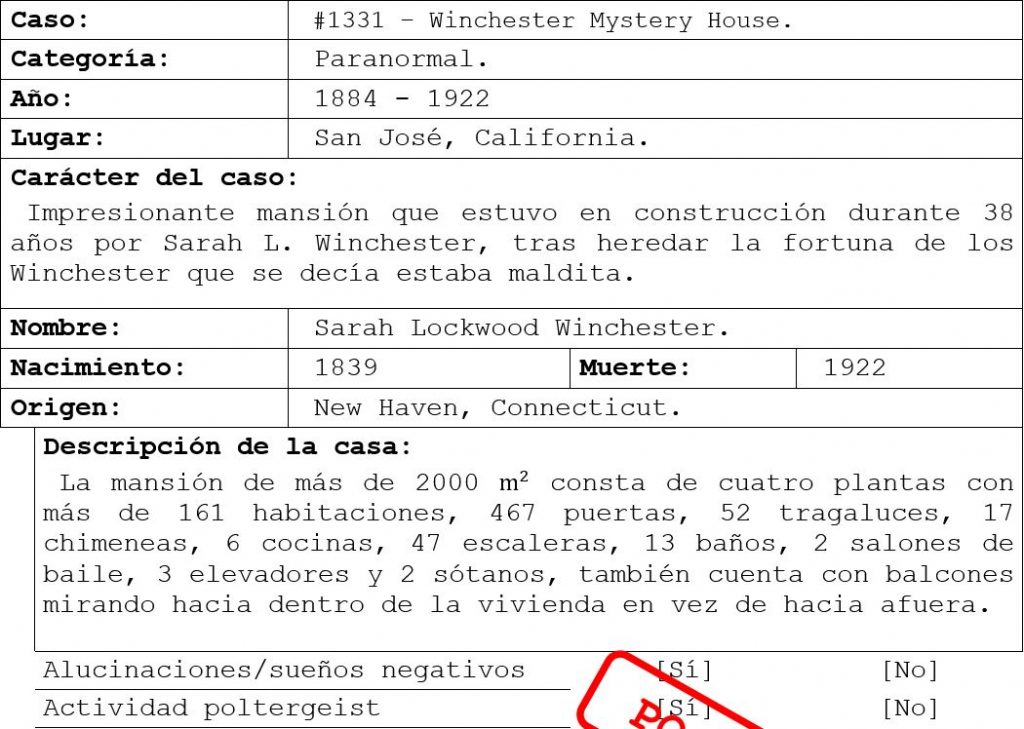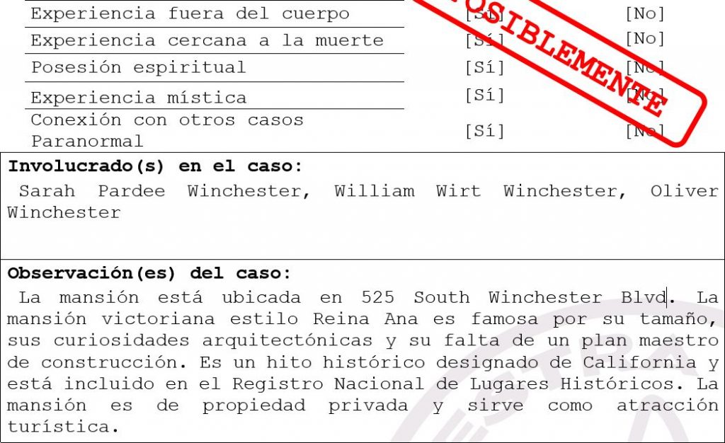 Muchos acontecimientos extraños han ocurrido a través del tiempo, personas que han intentado habitar la mansión dicen que adentro existe un ambiente escalofriante. Otras más que han visitado la casa o que han ido a hacer investigaciones dicen haber visto que espíritus deambulan por ella, incluyendo el fantasma de Sarah Winchester