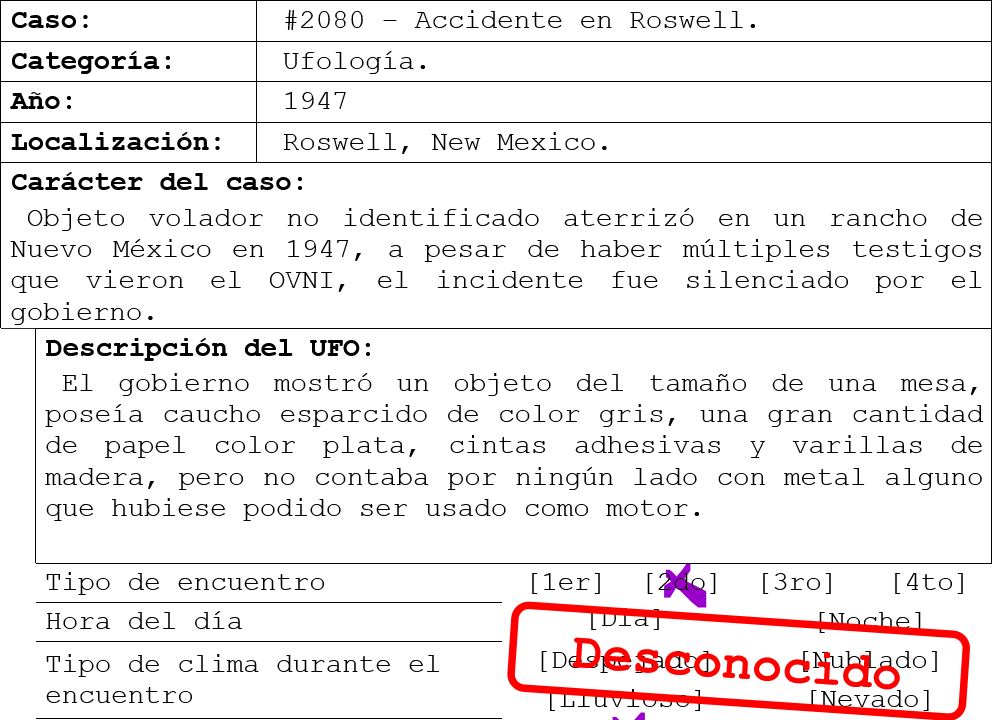 – “Los múltiples rumores sobre discos voladores se hicieron realidad ayer cuando la oficina de inteligencia del Grupo de Bombardeo 509 de la Octava Fuerza Aérea, Campo Aéreo del Ejército de Roswell, tuvo la suerte de obtener en su posesión escombros de al parecer, una nave no reconocida, Esto fue posible gracias a la cooperación de civiles de la localidad y la oficina del alguacil del condado.