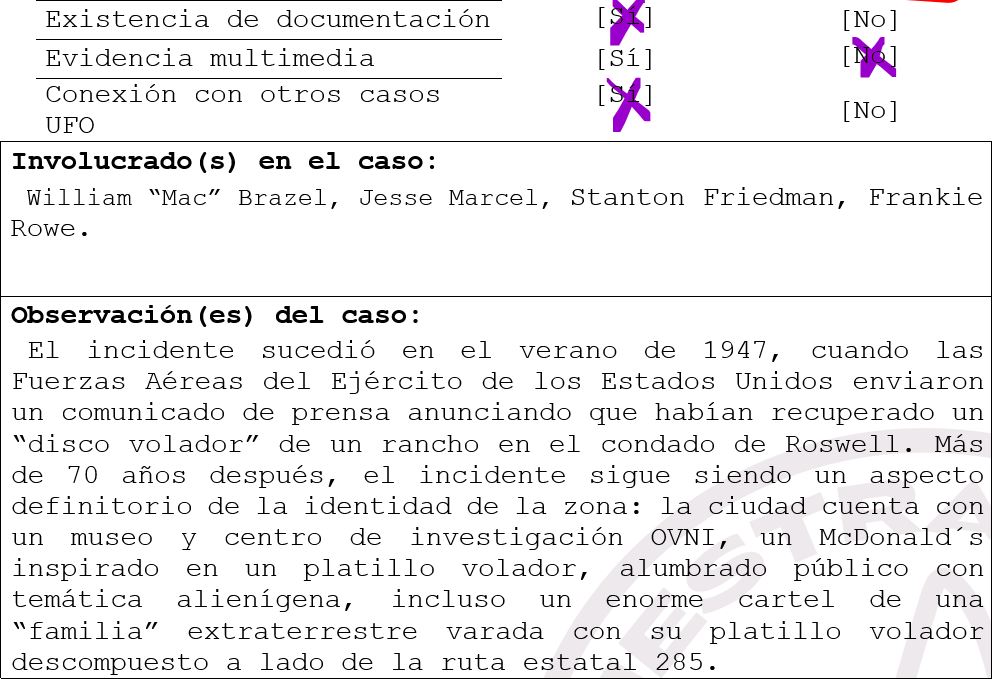 El objeto volador aterrizó en un rancho cerca de Roswell en algún momento de la semana pasada. Al no tener instalaciones telefónicas, el ranchero W. Brazel guardó el disco hasta el momento que pudo comunicarse con la oficina del alguacil, quien a su vez notificó al mayor Jesse A. Marcel de la Oficina de Inteligencia del Grupo de Bombas 509. Se tomaron medidas de inmediato y se recogió el disco en la casa del ganadero. Fue inspeccionado en el Campo Aéreo del Ejército de Roswell y posteriormente prestado por el Mayor Marcel a un cuartel general superior”.
