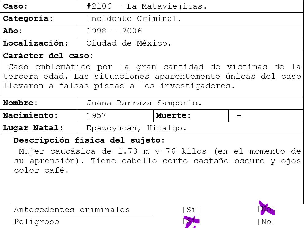 A principios de los 2000 cuando en la Ciudad de México comenzaron a aparecer cuerpos de mujeres de la tercera edad asesinadas de manera violenta en sus propias casas, las autoridades actuaron dubitativa y poco eficiente, la presión mediática y social dejaron al descubierto muchas deficiencias por parte del sistema. Tan solo en el año 2002 nueve víctimas fueron encontradas con estas características.