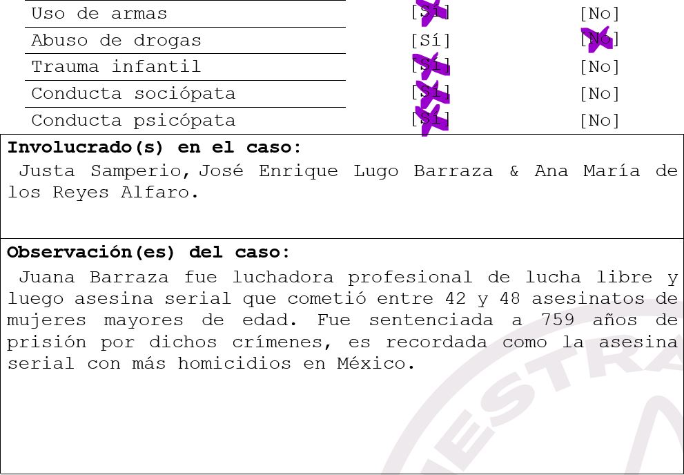 El 25 de enero de 2006, una mujer de 49 años identificada como Juana Barraza, era detenida en Ciudad de México, acusada de asesinar a Ana María de los Reyes Alfaro, de 82 años. La anciana había sido estrangulada hasta la muerte con un estetoscopio y apuñalada violentamente en varias ocasiones con un cuchillo militar.