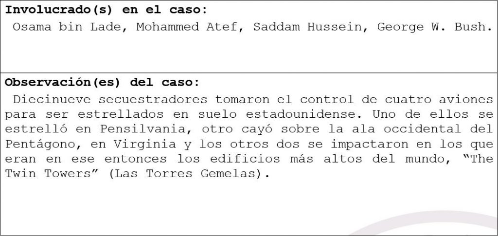 Al paso de los días se obtuvieron intercepciones que revelaron conversaciones que tuvieron lugar días antes del 11 de septiembre entre bin Laden y un asociado en Pakistán. En esas conversaciones, los dos se refirieron a “un incidente que tendría lugar en Estados Unidos el 11 de septiembre” y discutieron las posibles repercusiones. En otra conversación con un asociado en Afganistán, bin Laden discutió la “escala y los efectos de una próxima operación”.