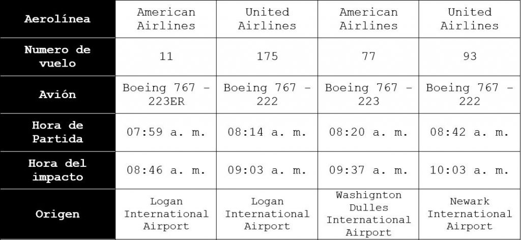 A las 8:46 am, cinco secuestradores estrellaron el vuelo 11 contra la Torre Norte del World Trade Center. A las 9:03 am, otros cinco secuestradores estrellaron el vuelo 175 en la Torre Sur. Cinco secuestradores más tomaron el vuelo 77 cayó en los límites del Pentágono a las 9:37 am. Mientras que el cuarto vuelo, el 93 de United Airlines, se estrelló en Pensilvania, al sureste de Pittsburgh, a las 10:03 am después de que los pasajeros lucharan contra los cuatro secuestradores. Una vez que se hizo evidente que los pasajeros podrían tomar el control, los secuestradores hicieron rodar el avión y lo estrellaron intencionalmente. Se cree que el objetivo del vuelo 93 era el Capitolio o la Casa Blanca.