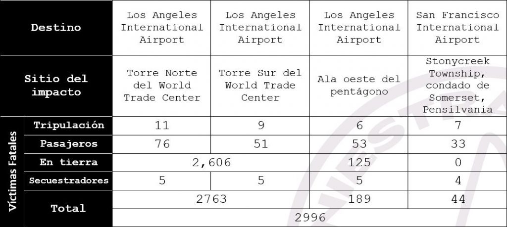 Temprano en la mañana del 11 de septiembre del 2001, fueron raptados cuatro aviones comerciales, dos Boeing 757 y otros dos Boeing 767. Tres de ellos iban con dirección a Los Ángeles y uno hacía San Francisco. Dentro de los cuatro aviones, iban repartidos diecinueve militantes asociados con el grupo extremista islámico “Al Qaeda” y llevaron a cabo ataques suicidas contra varios objetivos en Estados Unidos.