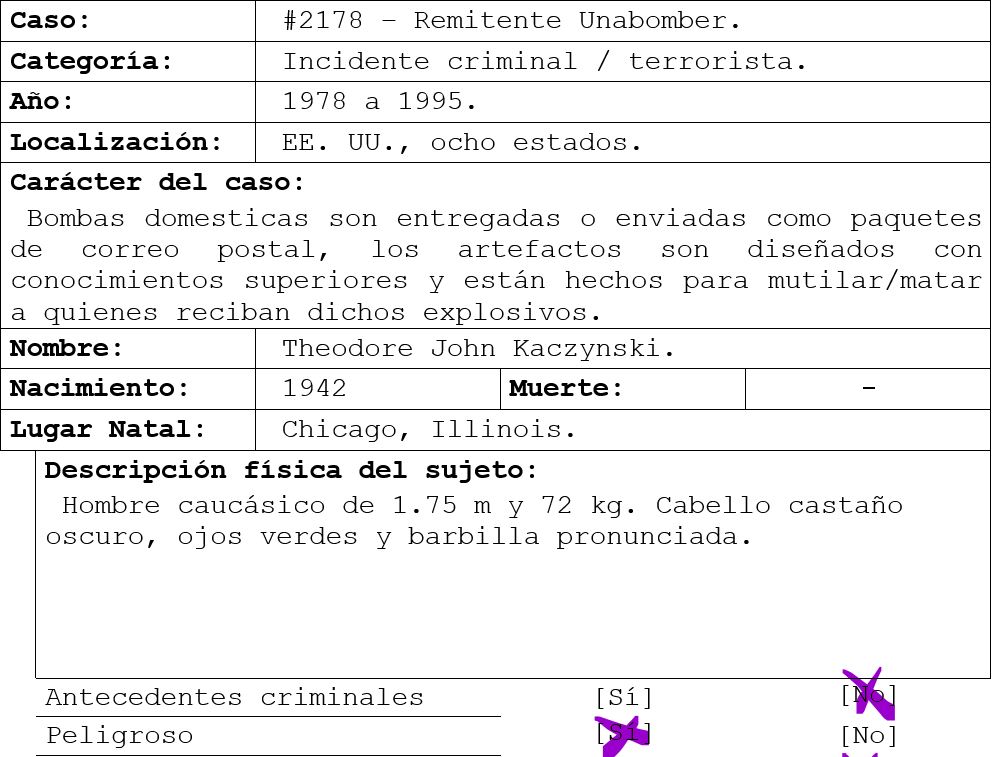 David Kaczynski, hermano menor de Ted, fue uno de los millones de personas que leyeron el manifiesto, pero él fue el único que noto algunos rasgos familiares en la forma de escribir del autor. David decide buscar entre papeles y cartas viejas de la familia para corroborar sus sospechas, encuentra una carta de Ted de los años 70’s, carta que le escribió a un periódico local para protestar sobre el abuso de la tecnología, usando frases similares al manifiesto.