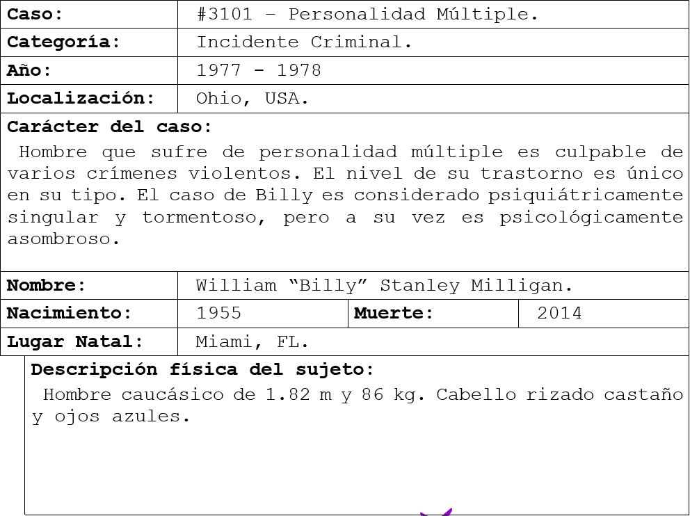 Octubre 1977. Un sujeto es detenido en Ohio, es identificado como William “Billy” Stanley Milligan y no es la primera vez que él está en problemas. Hace dos años ya estuvo en el instituto correccional, pero esta vez es acusado de cargos mucho más serios: secuestro, robo y violación. Su comportamiento es extraño, no responde al nombre de Billy y se ve desorientado. El oficial de policía quien hizo el arresto, Elliot Boxerbaum, informó que durante el camino hacia el departamento de policía él sentía que hablaba con diferentes personas, como si Billy por ratos no fuera Billy. En el departamento de policía se genera la orden de cateo para registrar el domicilio de William, dentro de la vivienda la policía encuentra ropa de mujer, de hombres, juguetes, pinturas, armas, instrumentos de música y demás, parece como si vivieran varias personas en el mismo lugar.